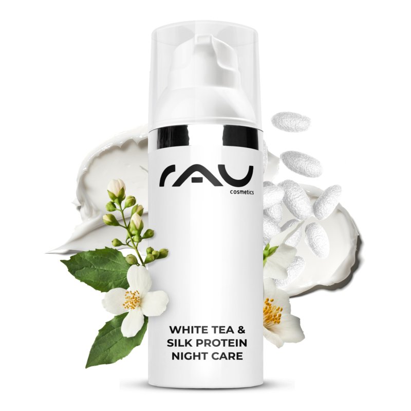 Our feel-good night cream: White Tea & Silk Protein Night Care. A rich and at the same time delicate blend of valuable silk proteins, white tea, panthenol, shea butter and natural oils surrounds the skin like a protective shell and provides it with important nutrients that support regeneration.